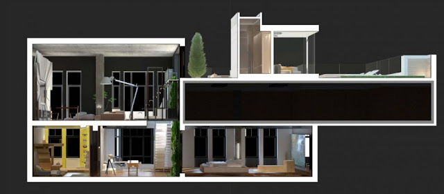 Widać to na każdym kroku , jak swobodnie bawią się projektowaniem stosując różnorodne ciekawe pomysły na każdym z pięter. Budynek jest 3 – poziomowy o łącznej powierzchni 380 m2 z ogromnym tarasem na dachu , który również został ciekawie zaprojektowany.