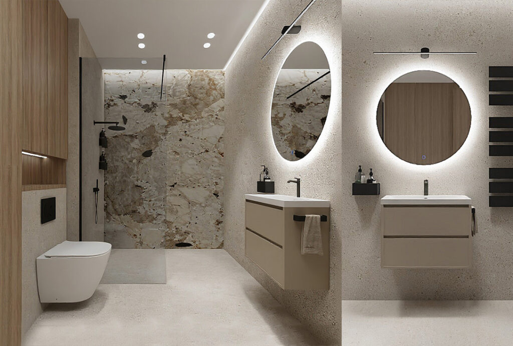 At the end of the room, there is a spacious shower with decorative tiles and subtle LED lighting from above. This element gives the interior a modern character and emphasizes attention to detail. The whole is maintained in a consistent style, corresponding to the character of the entire apartment.