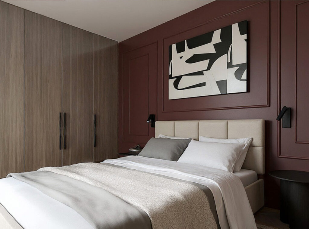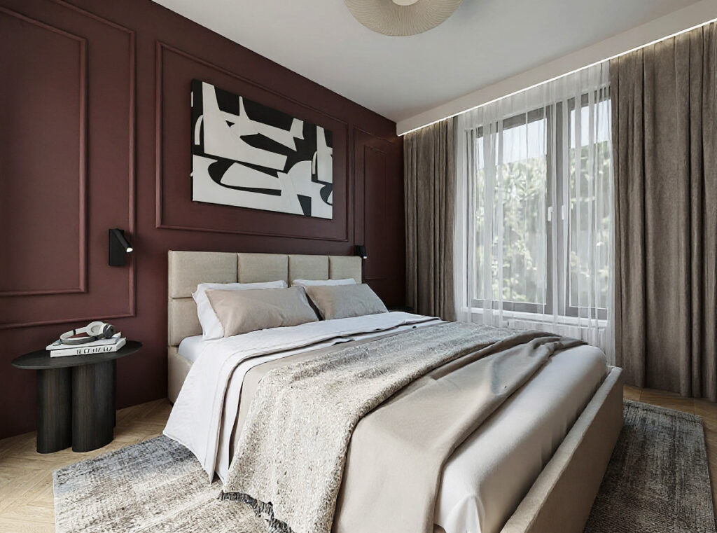 The bedroom has been designed as a calm yet distinctive space. The central element is a burgundy wall with stucco, located behind the double bed. This detail adds elegance to the interior and emphasizes the modern yet slightly classic character of the design.