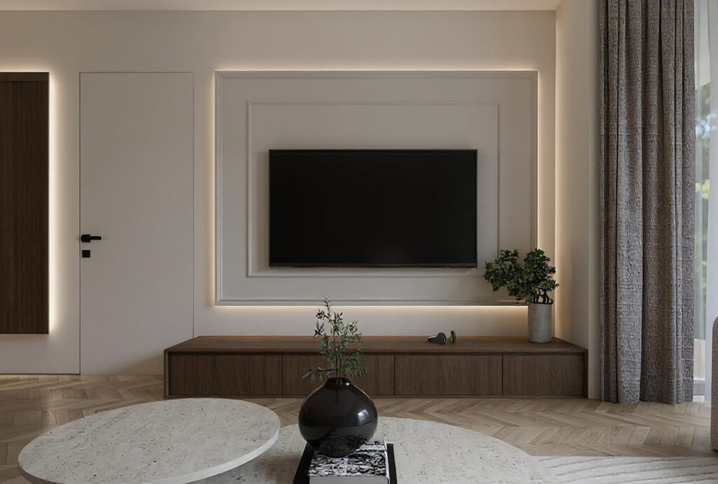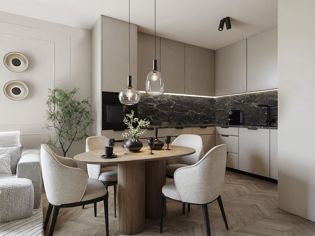 Celem jest ergonomia, logiczny przepływ i maksymalne wykorzystanie przestrzeni. W kawalerce każdy centymetr ma znaczenie – dlatego stosuję m.in. zabudowy wielofunkcyjne, meble na wymiar i sprytne podziały stref.