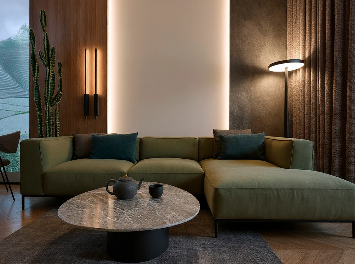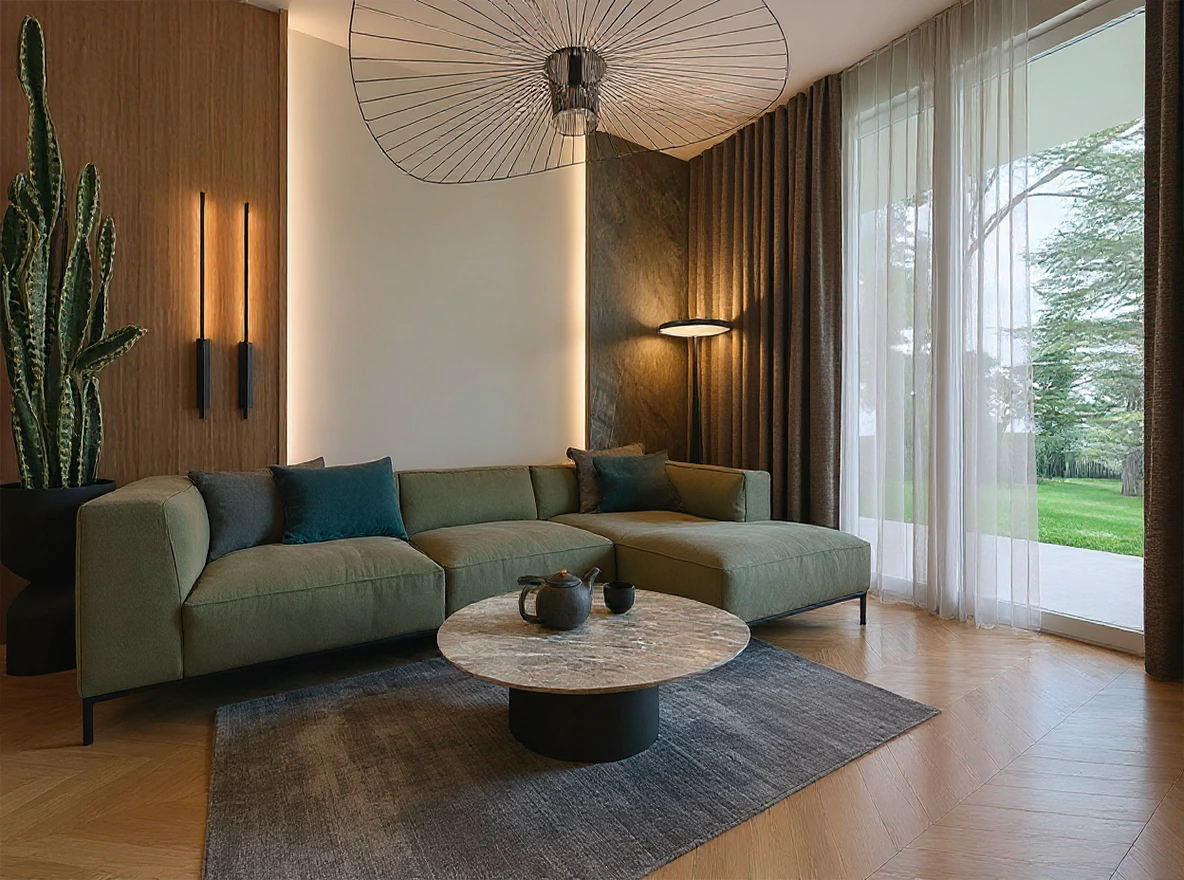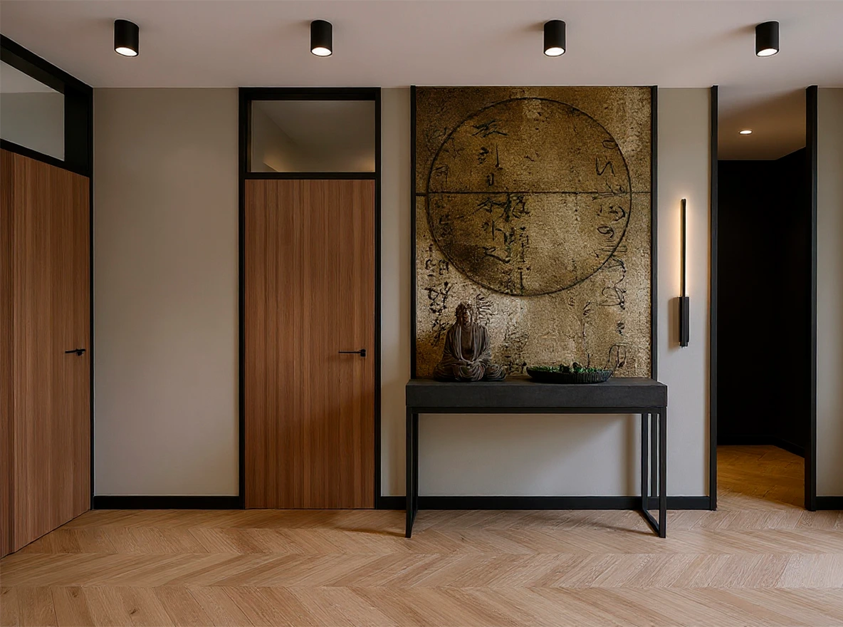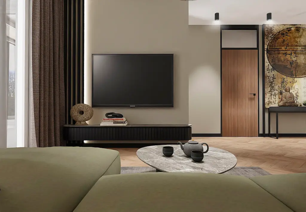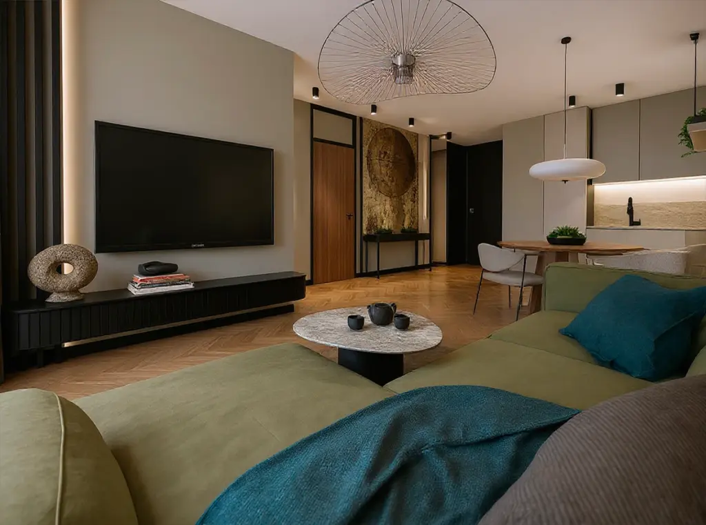 W mieszkaniu przeważa kolorystyka zgaszonej zieleni, która niesie za sobą skojarzenie z widokami pól ryżowych wyłaniających się z porannej mgły oraz dzikiej dżungli. Taki właśnie widok klienci chcieli abym umieściła na ścianie wkomponowany w drewniane panele przy stole jadalnianym. Dodatkową pamiątką z podróży jest obraz, który znajduje się w holu nad komodą. Czarne listwy dekoracyjne zamontowane na ścianie są nawiązaniem do drewnianej architektury Wietnamu tworząc spójną kompozycję, która wydziela lustro w przedpokoju oraz przestrzeń na konsolę. Do pionowych wysokich podziałów nawiązuje konstrukcja drzwi, które zostały podwyższone do sufitu i wydzielone czarną ramą doświetlając jednocześnie łazienkę od góry przeszkloną częścią nadając w ten sposób oryginalności temu wnętrzu. Geometryczne linie jakie tworzą czarne linie we wnętrzu przełamują obłe kształty lamp wiszących jak i stołu jadalnianego, krzeseł , stolika kawowego a nawet szafki RTV o miękko zakończonej krawędzi. W przytulnym kąciku salonu króluje rozłożysta sofa w odcieniu złamanej zieleni pozwalająca na relaks w harmonii otaczających ją kolorach.