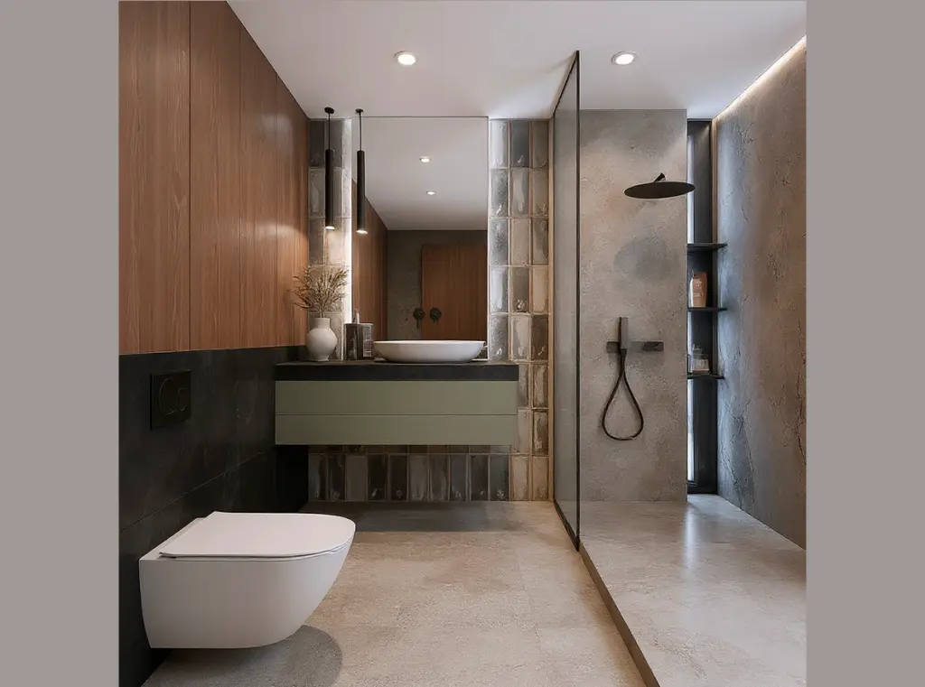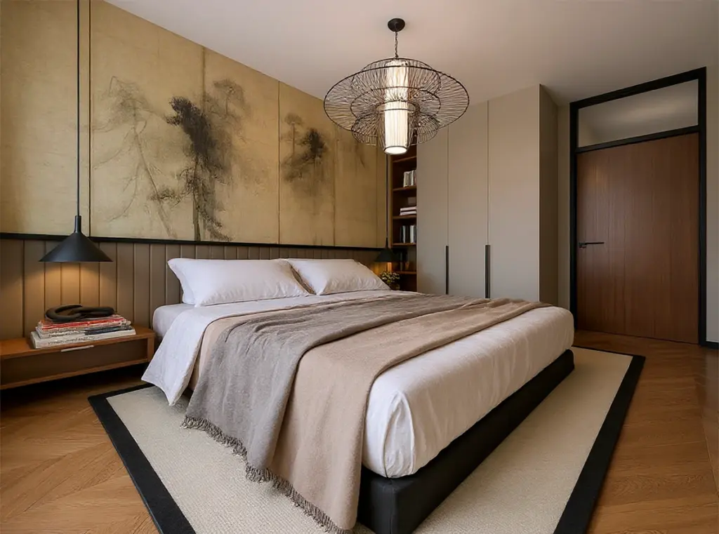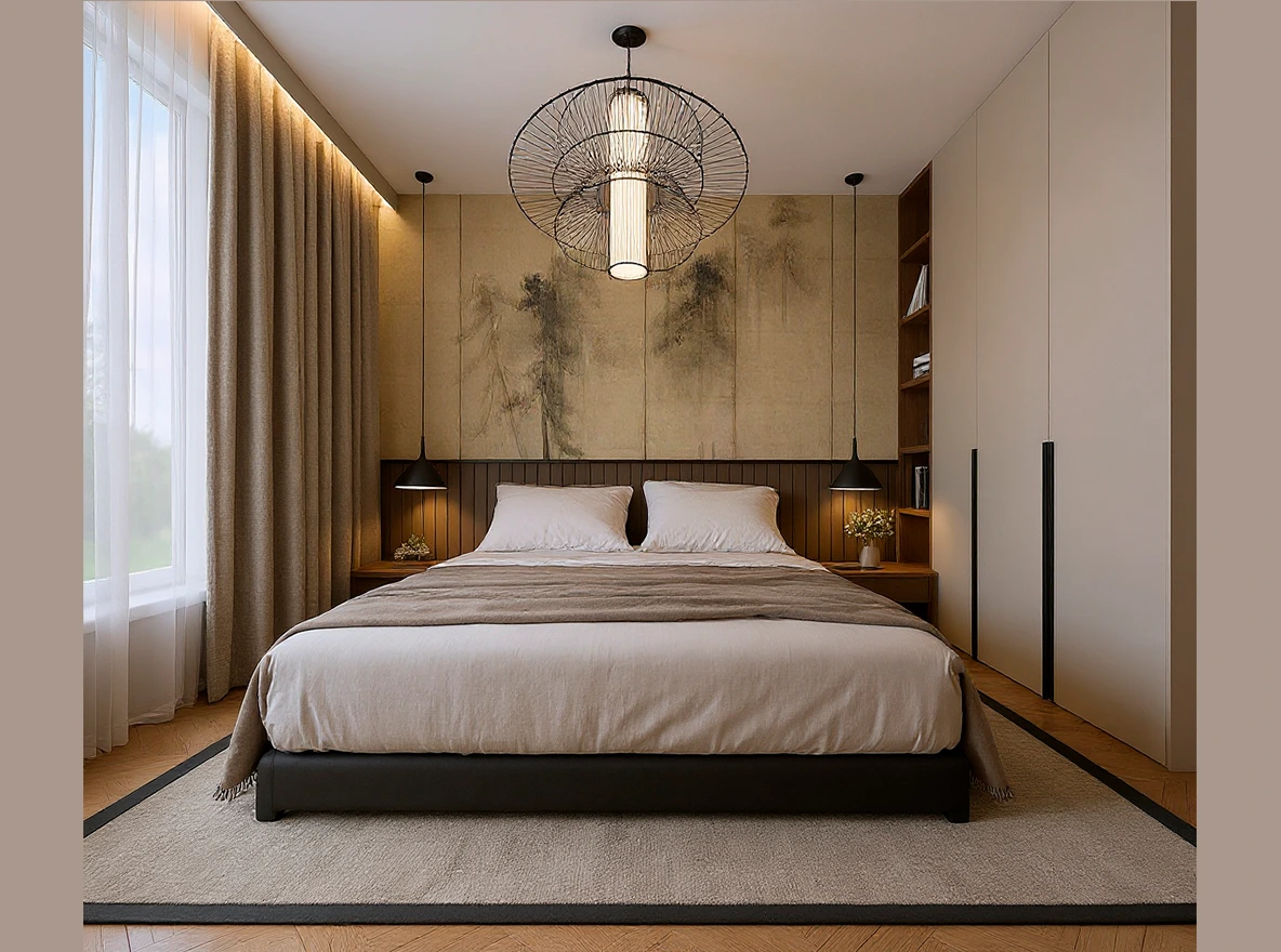 Ciepłem emanuje także sypialnia, w której kolorystyka stanowi spójne dopełnienie strefy dziennej. W tym pomieszczeniu króluje tapeta nad łóżkiem, inspirowana sztuką japońską. Miękkości nadaje szeroki tapicerowany wezgłówek oddzielony od tapety czarną listewką, która nawiązuje do pozostałych czarnych elementów w sypialni takich jak : lampy , konstrukcja drzwi, czy łóżka. W wysokiej zabudowie nie zabrakło miejsca na książki, do których łatwy jest dostęp ze strony łóżka. Całość domyka rozłożysty dywan w stylistyce japońskiego minimalizmu. Odprężająca atmosfera łazienki czerpie inspiracje z odcieni natury w różnych jej barwach. Pojawia się tu płytki w kolorystyce od najciemniejszego gresu poprzez bardziej naturalny odcień piaskowy. Z tego samego ciemnego gresu powstał również blat na szafce po umywalką tworząc kontynuacje zabudowy. Wisząca szafka w kolorze aloesowej zieleni ciekawie kontrastuje z ciemnym odcieniem gresu. Dodatkowym miejsce do przechowywania jest delikatnie rozświetlona wnęka pod prysznicem, w której znajdują się półki na kosmetyki. Dopełnieniem są czarne baterie w wykończeniu matowym. Takie samo wykończenie prezentuje bateria kuchenna, a w ślad za nią idą także wszystkie klamki, tworząc w ten sposób uporządkowaną, wyciszoną przestrzeń, bo przecież taka służy najlepiej wyciszeniu i relaksowi. Podczas wyboru koloru ścian nie bez powodu padło na kolor zielony. Według badań wpływ tego koloru wpływa pozytywnie na nasze samopoczucie oraz poziom zrelaksowania. Osiedle : PRZYLESIE , SOPOT
