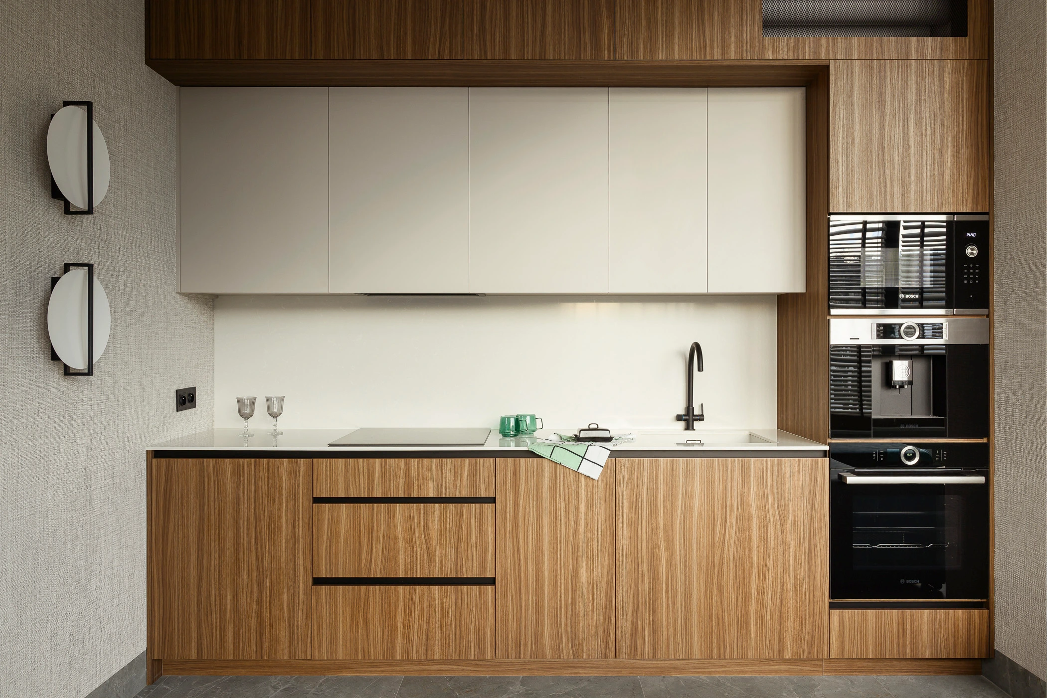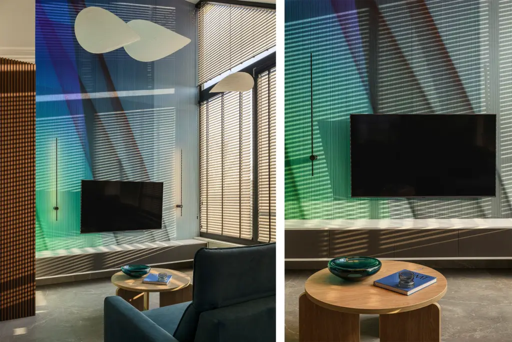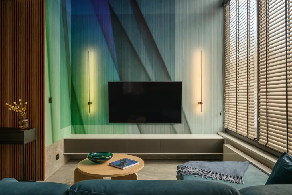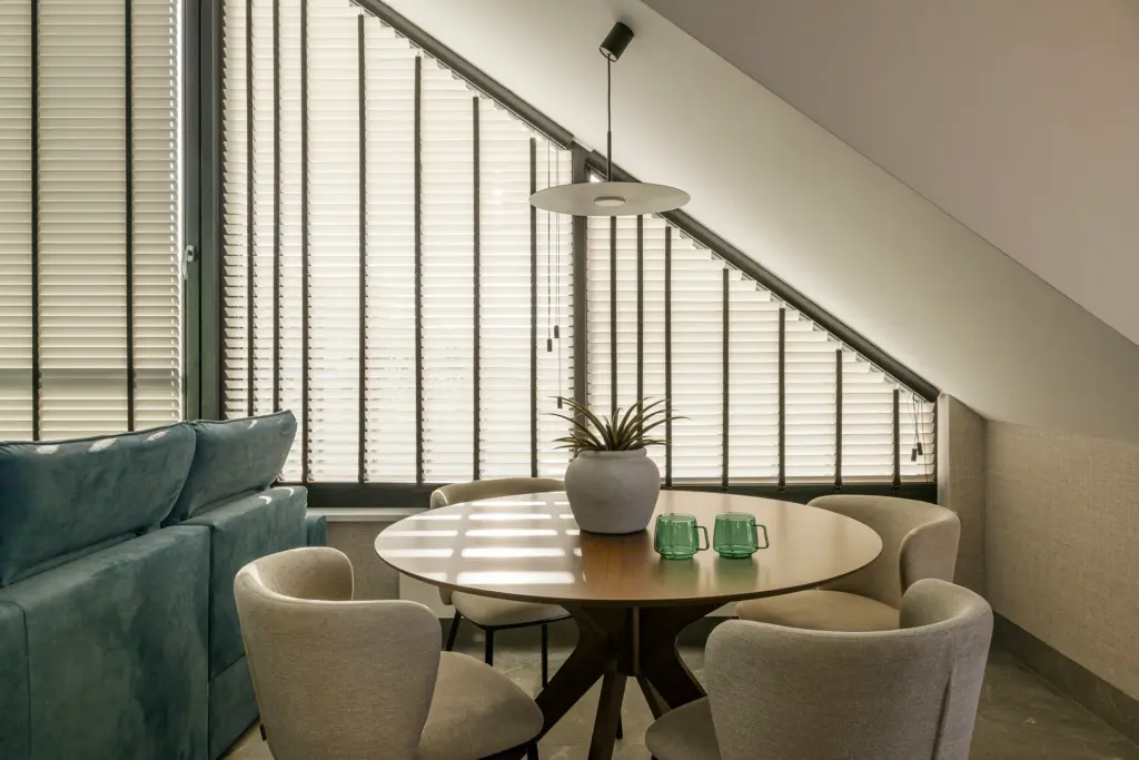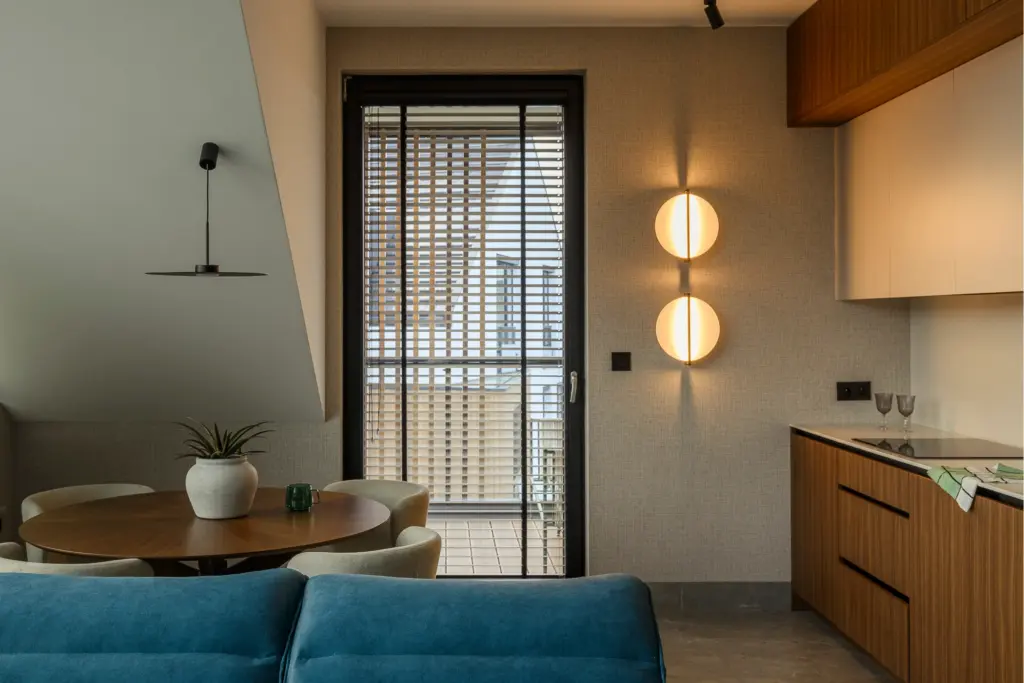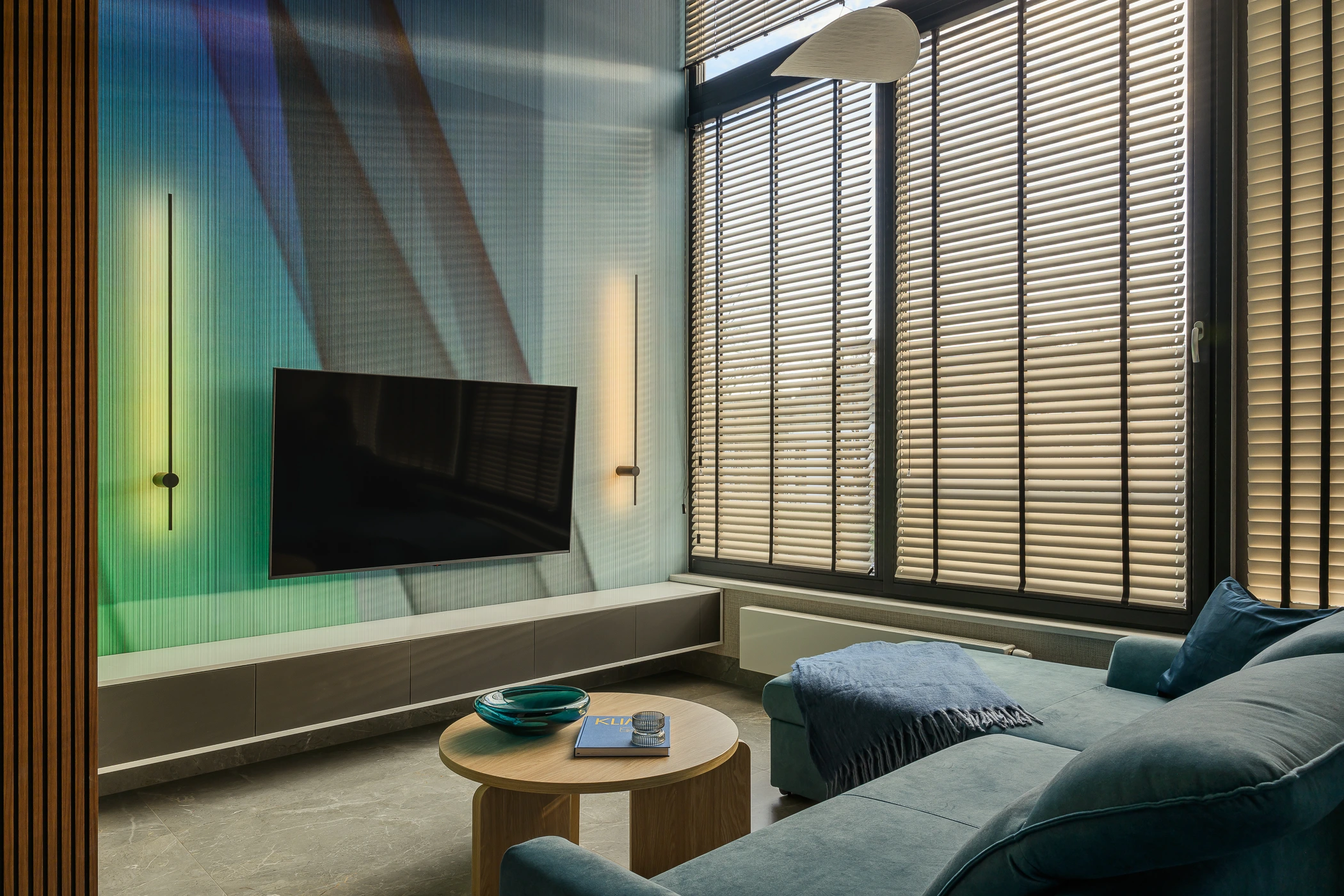 Centralnym punktem mieszkania jest przestronny salon z aneksem kuchennym, w którym postawilłam na wyraziste, energetyczne akcenty kolorystyczne. Klient był otwarty na oryginalne i niekonwencjonalne rozwiązania, dlatego mogłam pozwolić sobie na zdecydowaną paletę barw, rzadko spotykaną w typowych realizacjach. W samym centrum salonu stanęła efektowna turkusowa sofa, która nadaje całemu wnętrzu świeżości i dynamiki. Jest to element, który od razu przyciąga wzrok i stanowi kluczowy punkt aranżacji. Ściana telewizyjna została wzbogacona o tapetę wykonaną na zamówienie pod pełny wymiar ściany – autorski projekt w odcieniach turkusu i głębokiego błękitu. Jej intensywne kolory są subtelnie podkreślone przez podłużne kinkiety umieszczone po bokach telewizora. Dopełnieniem kompozycji jest wysokie, trójkątne okno – element charakterystyczny. Jego formę podkreśliłam minimalistycznymi czarnymi żaluzjami, które nie tylko dodają elegancji, ale również pozwalają na precyzyjne sterowanie światłem dziennym. Zabudowa kuchenna została wykonana z fornirowanych frontów, dzięki czemu aneks kuchenny łączy w sobie naturalne piękno drewna i nowoczesną elegancje.
