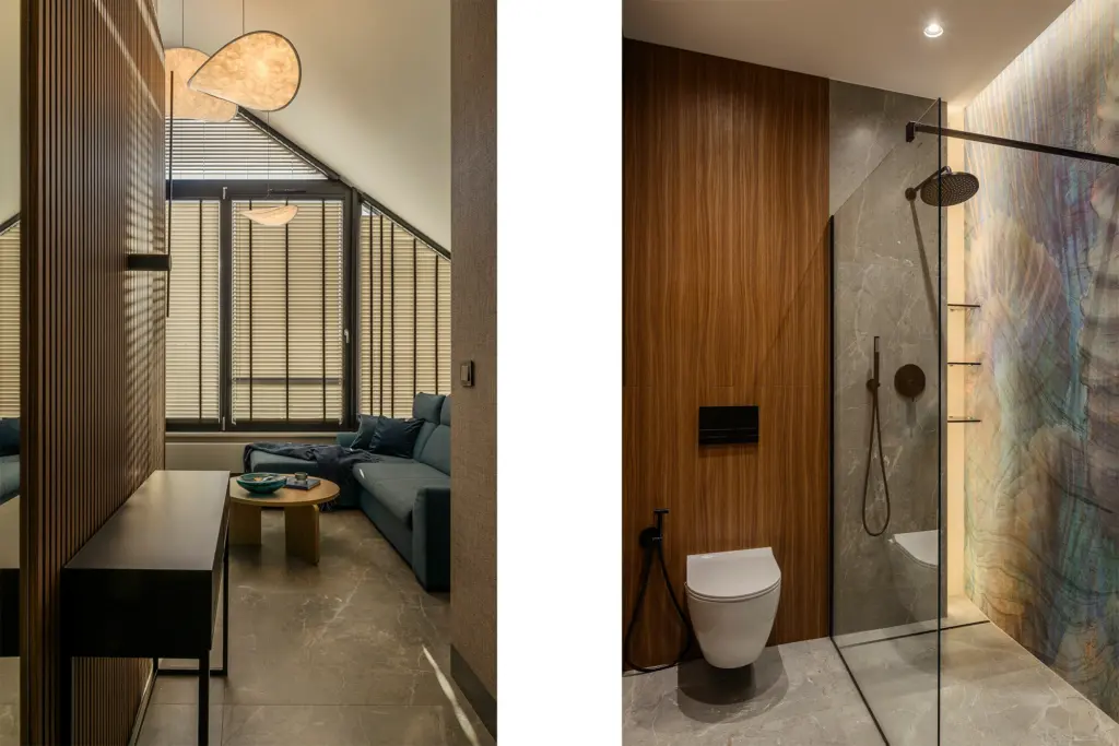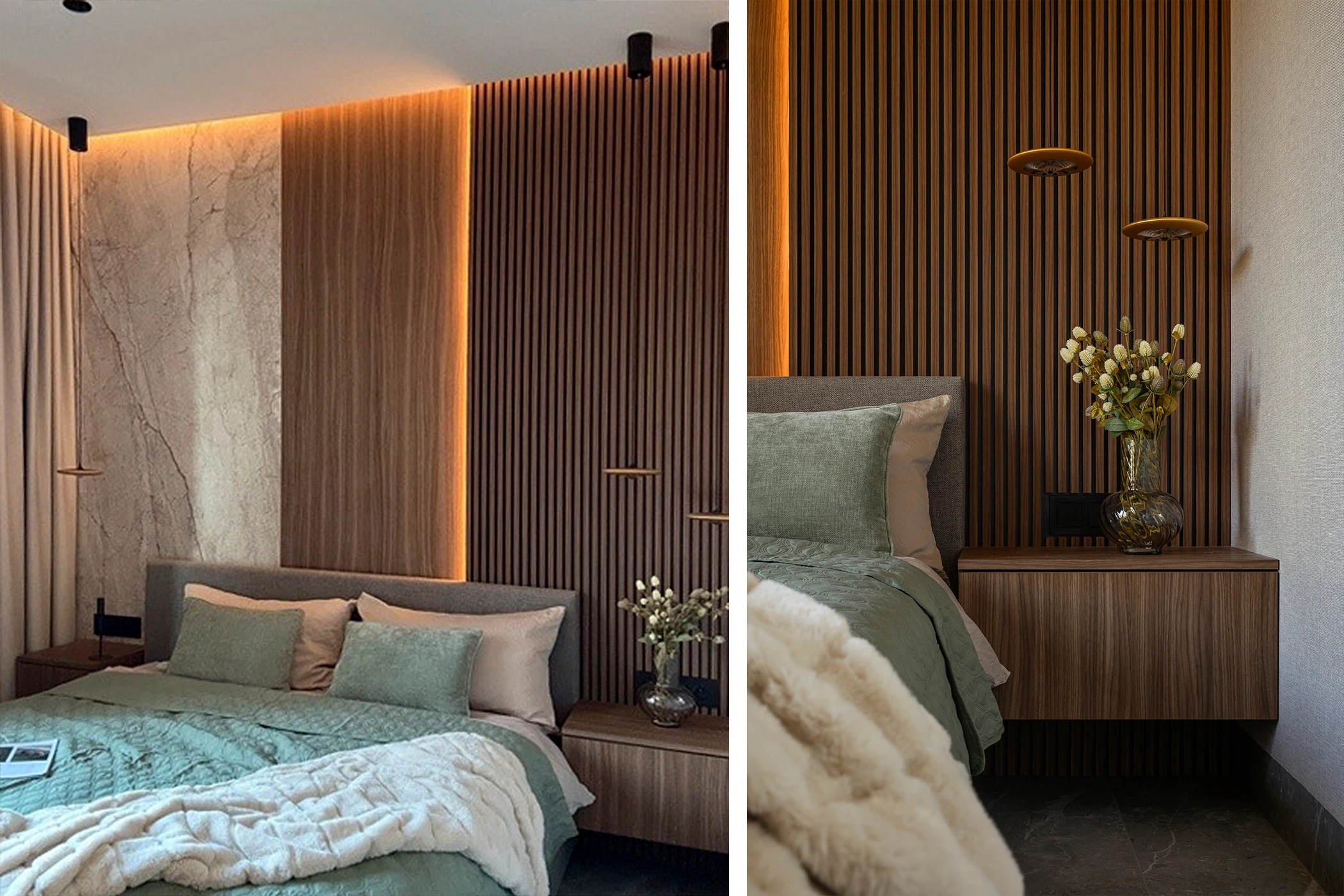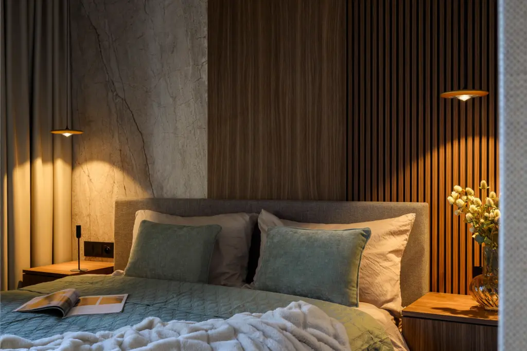 Chociaż salon pełen jest energii i koloru, sypialnie zaprojektowałam jako oazę spokoju, w której dominuje stonowana, beżowa paleta. Za łóżkiem zaprojektowałam ścianę wykończoną drewnianymi panelami z delikatnym, nastrojowym podświetleniem w postaci pionowej taśmy LED ukrytej za panelem. Uzupełnieniem aranżacji tej ściany jest spiek wielkoformatowy o kamiennym wzorze, nadający sypialni nowoczesnego, ponadczasowego charakteru. Subtelne połączenie naturalnych materiałów sprawia, że przestrzeń jest harmonijna i sprzyja relaksowi.